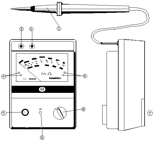 通常儀表的功能開關⑥置于OFF位,在進行測量時將它置于MΩ或GΩ位,從儀表的地端③和②分別引出兩根測試線到被測物的地端和大地,再將儀表的探頭①接被測物測試點并按測試紐⑤(順時針方向旋轉后可自鎖)既可開始測量.