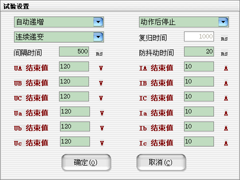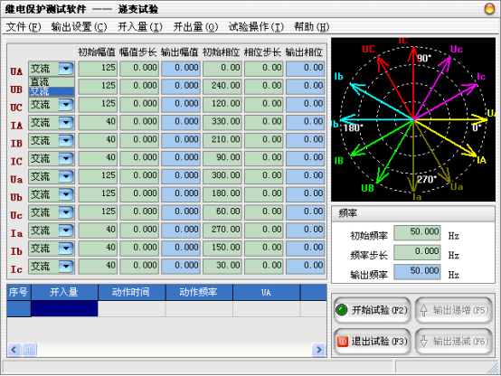 當需要使用的輸出相被選擇后,可以設定微機繼電保護測試儀各輸出相的起始參數,比如幅值、相位,接著可以設定幅值的變化步長和相位的變化步長。一旦通道的輸出達到大值或小值后,如果試驗還沒有停止,通道繼續保持輸出,不再遞增或遞減。