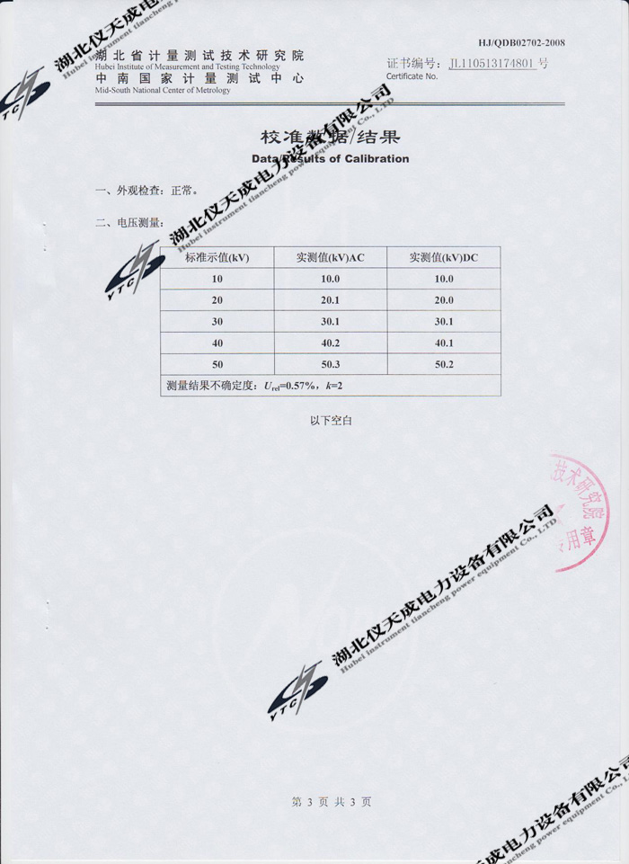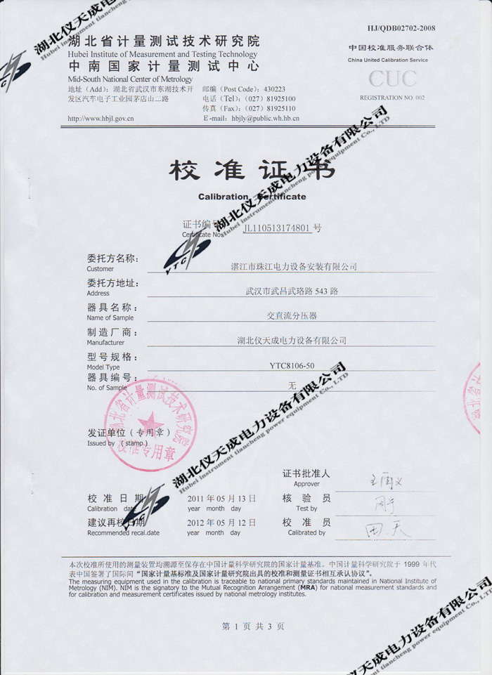 轉載:"YTC8106-50交直流分壓器的資質證書" 請注明來源于儀天成電力。 更多技術問題請致電儀天成電力客戶服務:027-87876585,技術部專線:027-87876585,在線客服:719388481