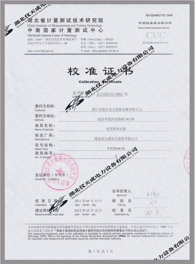 轉(zhuǎn)載:"YTC8106系列交直流分壓器鑒定證書(shū)" 請(qǐng)注明來(lái)源于儀天成電力。 更多技術(shù)問(wèn)題請(qǐng)致電儀天成電力客戶服務(wù):027-87876585,技術(shù)部專(zhuān)線:027-87876585,在線客服: